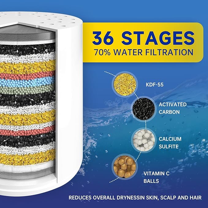 - ✅【UPGRADED 36-stage Filtration System】Featuring an advanced multi-stage filtration system comprising KDF 55, Calcium Sulfite, Activated Carbon, Vitamin C, and other cutting-edge filtering materials. This innovative technology ensures the complete removal of chlorine, heavy metals, rust, sand, and other sediments, guaranteeing the highest standard of water purity.