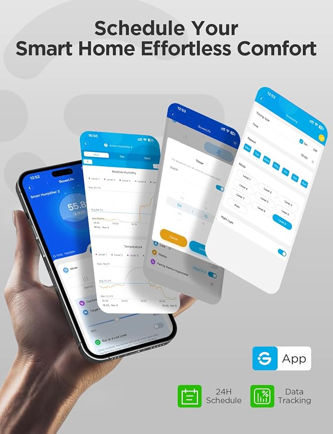 - Auto Mode for Precise Humidification: Built-in high-precision sensor combined with auto mode allows you to set and maintain the bedroom in the ideal humidity range, keeping you comfortable all winter. Connect GoveeLife Thermo-Hygrometer to maintain more precise humidity control and more convenient humidity calibration. (Thermo-Hygrometer not included.)