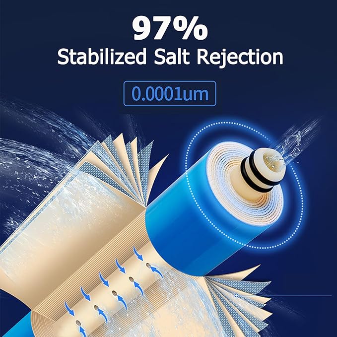 - Material & Technology: Vegebe RO membrane made of food-grade polyamide Thin Film Composite(TFC), adopts advanced membrane film technology and manufacturing processes ensures that water get the most surface area coverage and filtration. Meets NSF/ANSI 58 standards, providing safe-clean drinking water.