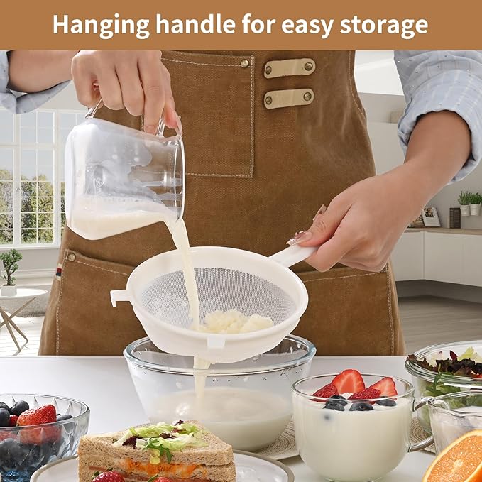 - Ergonomic & Space-Saving "Hangable strainers with wall-mount holes + non-slip handles for secure grip. Compact design fits drawers, while the double-ear structure ensures easy pouring of milk kefir, soy milk, or batter without spills."
