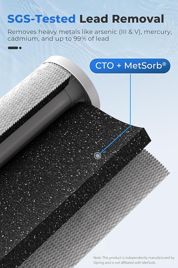 - Comprehensive Heavy Metal Filtration: Featuring advanced MetSorb media, our FC25B-PB water filter efficiently removes heavy metals like arsenic (III & V), lead, mercury, cadmium, and more. This superior filtration extends the lifespan of the filter, reducing replacement frequency. (Note: This product is independently manufactured by iSpring and is not affiliated with MetSorb.)