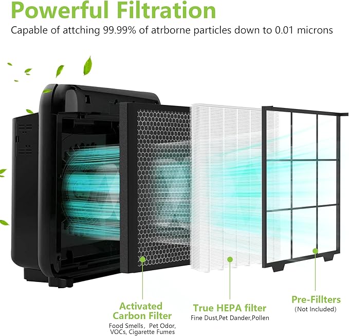 - 【Cost-effective】Included 2 Enhanced True HEPA Activated Carbon Filter,It has a stronger air purification function and is more environmentally friendly, reducing waste.True HEPA is designed with high quality H13 and eco-friendly material construction. The HEPA filter is made of microfiber pleated hundreds of times, which helps adsorb 99.7% of air particles as small as 0.3 microns and filters out unpleasant odors, so you can breathe fresh air freely,