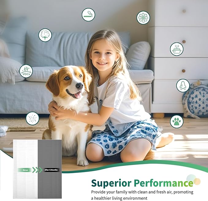 - EXCELLENT FILTRATION PERFORMANCE: The air purifier filter replacement adopts composite wet framework filter material to filter 0.3 micron dust in the air, filter 99.97% of air particles, such as pet dander, and keep the air at home or office healthy and clean. The high-efficiency activated carbon filter sheet can reduce household odors such as pets, cooking, smoking, and volatile organic compounds. Using high-quality foam adhesive for bonding, elastic will not burst, longer service life