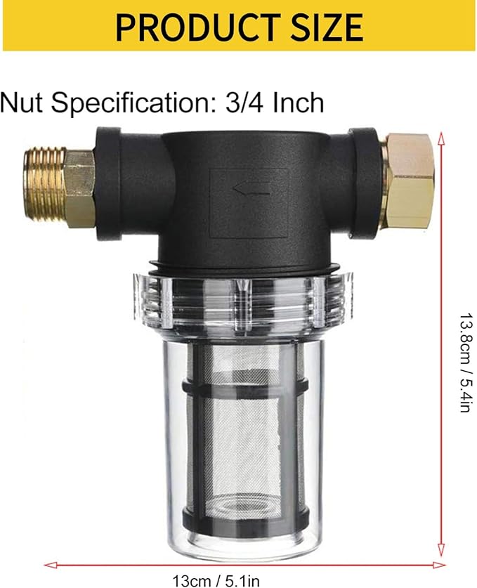 - 【Compatibility】Garden Hose Inlet Filter 3/4 inch. Male Inlet 3/4 inch, Female Outlet 3/4 inch, 40 mesh.