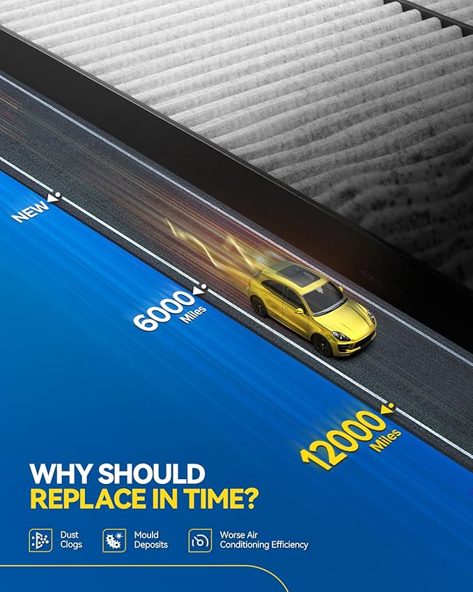 - [Warm Recommend]Replace every 12 months or when it drives to 12,000 miles. If you often drive in heavily polluted areas and muddy roads, it is recommended that you replace them frequently to keep the air fresh in the car