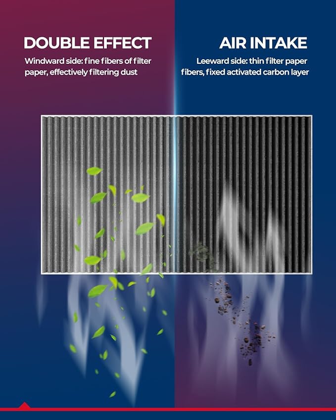 - 2-Layer Activated Carbon: Upgraded version with 2 layers of high-quality coconut shell activated carbon with stronger adsorption capacity, which can effectively remove peculiar smells and nasty odors in the air. Good air permeability, improving the heating and cooling efficiency of the car air conditioner, effectively prevent the musty smell in the car