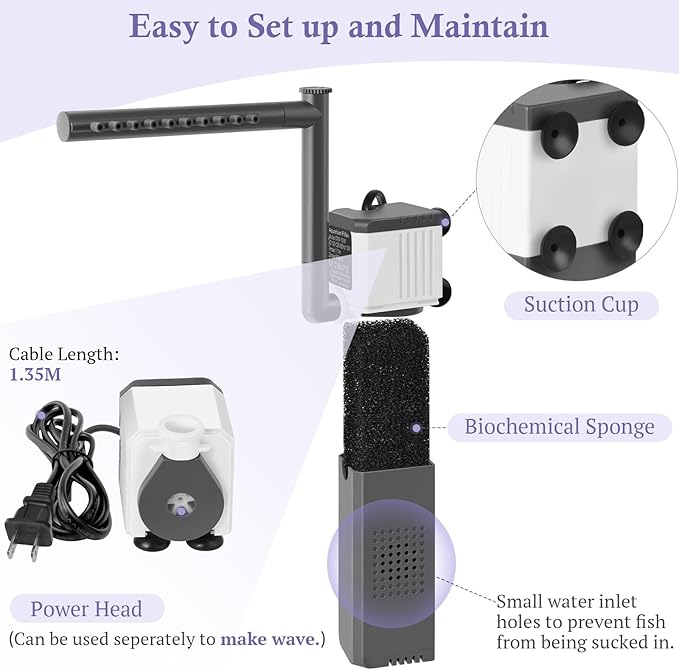 - [Super Powerful Aquarium Filter] This 10W fish tank filter is very powerful and generates very strong water flow, can effectively improve the filtration effect. Biochemical sponges can not only break down fish droppings and leftover feed, reducing odors in the fish tank, but also provide more place for nitrifying bacteria.