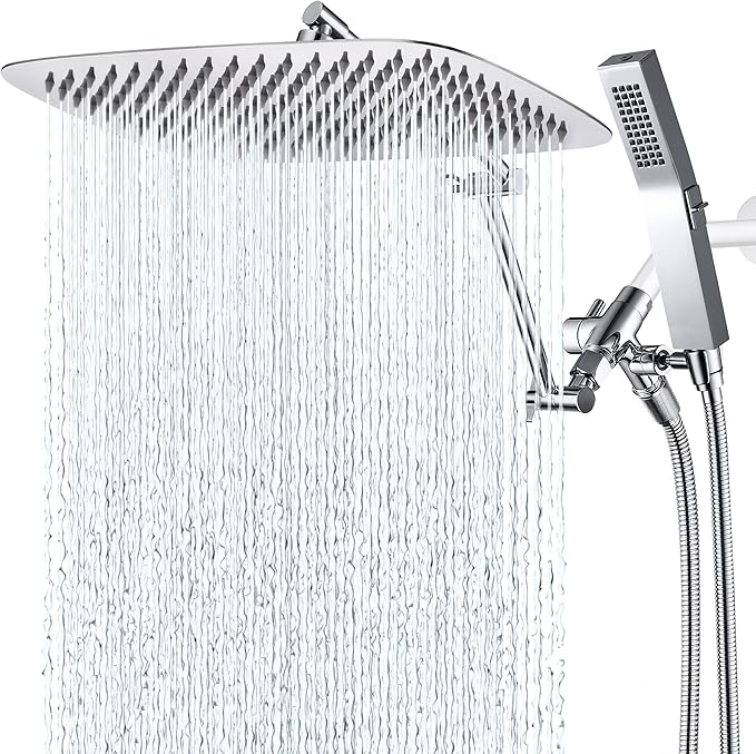 - SHOWER HEAD COMBO: 14" rainfall shower head with handheld wand. Both are metal construction that not easy to break. The top shower brings a powerful water flow to you. The handheld sprayer makes you feel a convenient shower experience