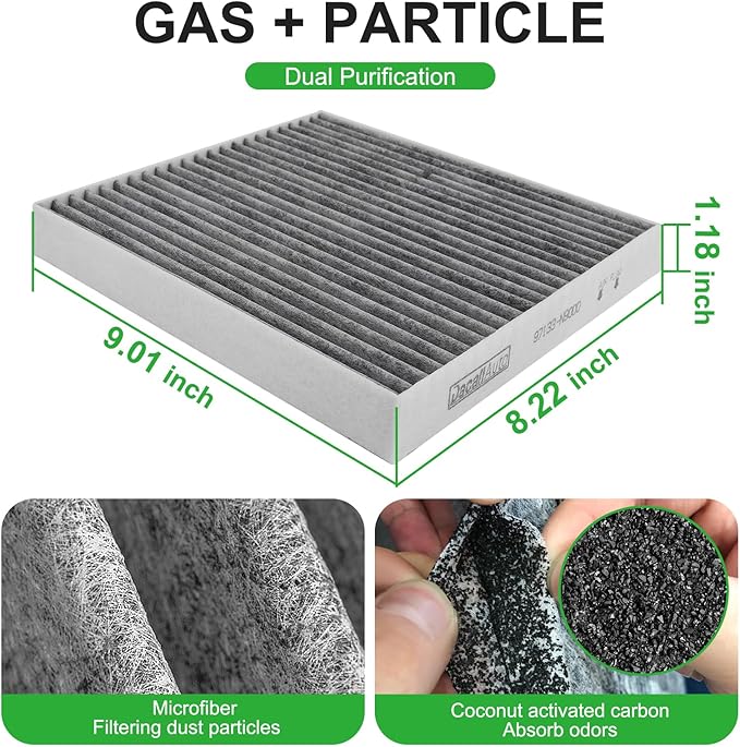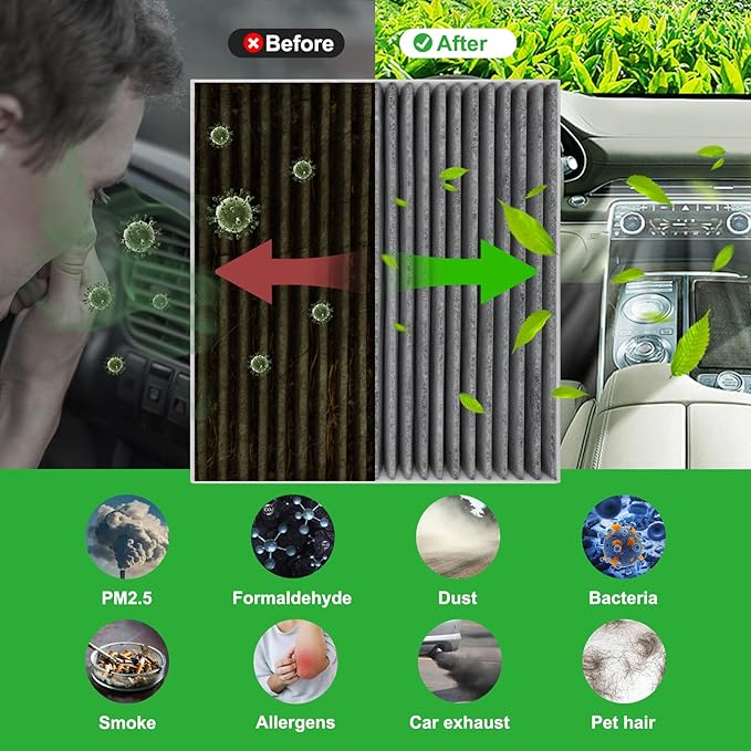 - Triple filtration technology: DacallAuto air filter adopts a 4-layer filtration structure, coconut shell activated carbon odor and a combination of microfiber and HEPA cloth, which not only effectively absorbs harmful gases and unpleasant odors, but also isolates more than 99% of dust particles, providing comprehensive protection and enjoying fresh breathing