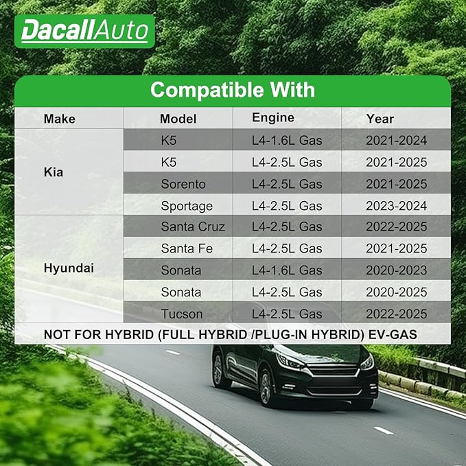- Fit for Hyundai: for Tucson L4-2.5L Gas (2022-2025); for Sonata L4-1.6L Gas (2020-2023), for Sonata L4-2.5L Gas (2020-2025); for Santa Cruz L4-2.5L Gas (2022-2025), for Santa Fe L4-2.5L Gas (2021-2025). Note: NOT FOR HYBRID, EV-GAS, ELECTRIC