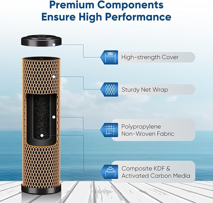 - ❄️ Heavy Metal Removal: Heavy metals pose significant health risks when present in drinking water. The activated carbon in our cartridge effectively adsorbs and binds to heavy metal ions, while the KDF media employs a reduction-oxidation process to neutralize and remove these contaminants from your water supply, providing you with cleaner and safer drinking water.