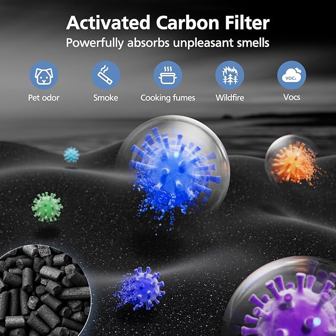 - ๐-๐ข๐ง-๐ ๐๐ข๐ ๐ก ๐ ๐ข๐ฅ๐ญ๐ซ๐๐ญ๐ข๐จ๐ง- The H7124/H712c air purifier filter for GoveeLife features 3 layers protection: โ nylon-pre-filter for visible larger particles like hairs, pet fur, โก hepa for unltra-fine airborne pollutants like pollen, pet dander, tiny dust,โข activated carbon for unpleasant smells like smoke, cooking fumes, providing a healthier and more pleasant indoor environment.