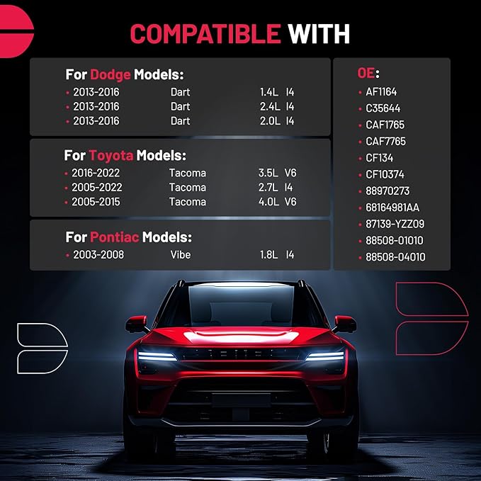 - 【Compatible Replacement】 Compatible with Toyota Models: 2016-2022 Tacoma 3.5L V6, 2005-2022 Tacoma 2.7L l4, 2005-2015 Tacoma 4.0L V6; Compatible with Dodge Models: 2013-2016 Dart 1.4L l4, 2013-2016 Dart 2.4L l4, 2013-2016 Dart 2.0L l4; Compatible with Pontiac Models: 2003-2008 Vibe 1.8L l4