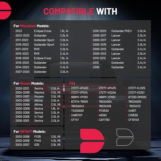 - 【Fitment】Compatible with Mitsubishi Models: 2023 Eclipse Cross, 2022-2023 & 2007-2020 Outlander, 2011-2022 Outlander Sport, 2011-2022 RVR, 2018-2020 Eclipse Cross, 2018-2020 PHEV, 2008-2017 Lancer; Compatible with INFINITI Models: 2003-2008 FX35/ FX45, 2003-2007 G35; Compatible with Nissan Models: 2004-2008 Maxima, 2000-2006 & 2020-2021 Sentra, 2003-2007 Murano, 2002-2006 Altima, 2005-2006 X-Trai