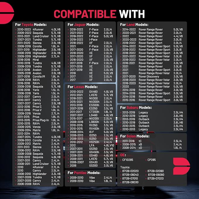 - 【Compatible Replacement】Compatible with Toyota Models: 2004-2020 Sienna, 2005-2018 Avalon, 2006-2018 RAV4, 2006-2018 Yaris, 2007-2017 Camry, 2007-2021 Tundra, 2008-2021 Land Cruiser, 2008-2019 Highlander, 2010-2016 Prius, 2010-2024 4Runner, 2012-2015 Prius Plug-In, 2012-2016 Prius V, 2012-2019 Prius C, 2016-2018 Yaris R, 2016-2023 Mirai, 2017-2018 Corolla iM; Compatible with Land Rover Models: 2014-2022 Range Rover/Range Rover Sport, 2017-2020 Discovery, 2018-2022 Range Rover Velar