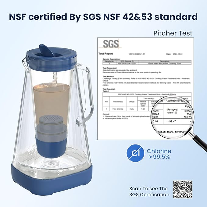 - Excellent 5-Stage filtration: This purela glass water filtration pitcher utilizes a comprehensive 5-stage filtration process that can effectively minimize the presence of 99% chlorine, taste&odor, sand, sediment and large particles.Our filtered water pitcher ensures that every sip is pure and revitalizing for you and your loved ones. To ensure you have great-tasting water, GLACIER FRESH recommend you change glass water purifier every 2 months or 40 gallons