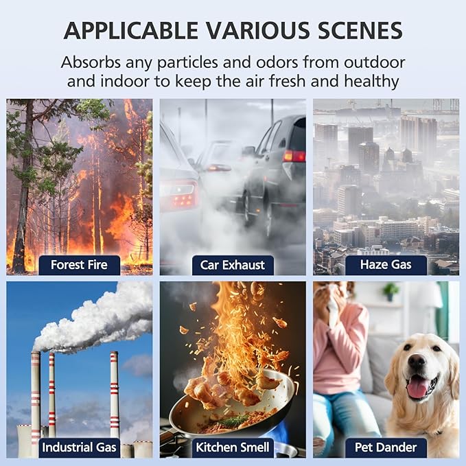 - 【HEPA Filtra-tion】: Our high efficiency FLT4825 air filt-ers are engineered with HEPA technology, effectively attach 99.97% of airborne particles as small as 0.3 microns. such as dust, pollen, pet dander, ensuring cleaner air in your home. Paired with activated carbon pre-filters, they neutralize odors from cooking, smoke, and harmful volatile organic compounds (VOCs), leaving your space fresh and breathable.