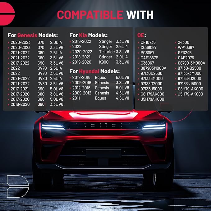 - [Vehicle Fitment] Compatible with Genesis G70 2020-2023, G80/G90 2017-2022, GV70 2022, GV80 2021-2022; Compatible with Hyundai Santa Fe 2019-2020, Equus 2011-2016, Genesis 2009-2016; Compatible with Kia Stinger 2018-2022, Telluride 2020-2022, Stinger 2018-2021, K900 2019-2020