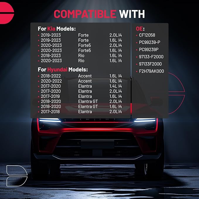 - [Vehicle Fitment] Compatible with Kia Forte 2019-2023 1.6L/2.0L l4, Forte5 2020-2023 1.6L/2.0L l4, Rio 2018-2023 1.6L l4; Compatible with Hyundai Accent 2018-2022 1.6L l4, Elantra 2017-2020 1.4L/2.0L l4, Elantra 2017-2019 1.6L l4, Elantra GT 2018-2020 1.6L/2.0L l4