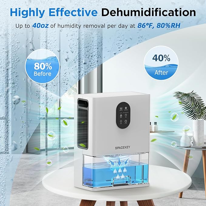 - High Efficiency Dehumidifier: SPACEKEY dehumidifiers for home utilize advanced semiconductor condensing technology with dual semiconductor construction. In a closed room at 86°F and 80% RH, the dehumidifier for bedroom collects up to 40oz (1,182ml) of excess moisture in 24 hours, releasing fresh, dry air with minimal energy consumption. 106oz large capacity water tanks are suitable for living rooms, bedrooms, bathrooms, checkrooms, and RVs.