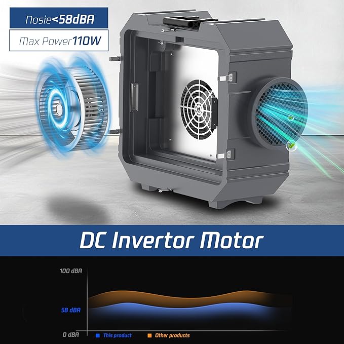 - 【Powerful Airflow and Ultra Low Noise】This commercial air purifier is equipped with advanced DC inverter motor, achieving stepless speed adjustment from 0 to 550 (CFM), capable of covering a space of 5500 cubic feet. The operating noise is as low as 58 decibels. Air scrubber is suitable for indoor decoration and demolition projects.
