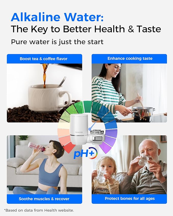 - Mineral-Rich Alkaline Water: Waterdrop countertop faucet alkaline filtration system instantly alkalizes your water, improving taste and adding essential minerals. It helps neutralize stomach acid, while promoting stronger bones and teeth with every sip.