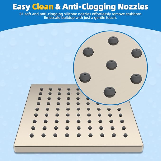 - Self-cleaning Silicone Nozzles: The rainfall shower head has 81 soft silicone nozzles, meticulously designed to prevent limescale buildup and clogging. These high-quality silicone nozzles not only ensure a safe and healthy bathing experience but also make cleaning a breeze. Wipe away any residue or buildup, and the self-cleaning properties of the silicone material will maintain the nozzles in pristine condition, ensuring an enjoyable shower every time