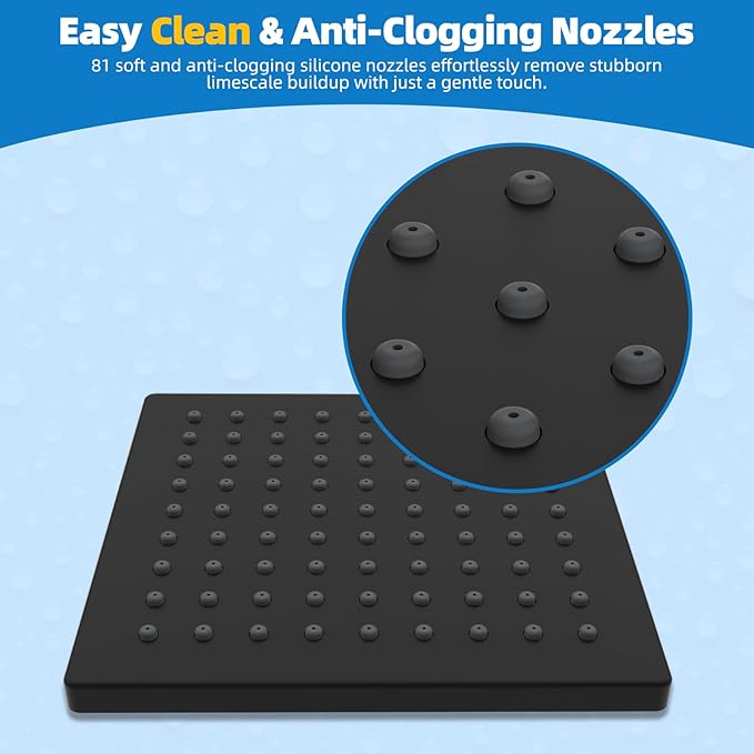 - Self-cleaning Silicone Nozzles: The rainfall shower head has 81 soft silicone nozzles, meticulously designed to prevent limescale buildup and clogging. These high-quality silicone nozzles not only ensure a safe and healthy bathing experience but also make cleaning a breeze. Wipe away any residue or buildup, and the self-cleaning properties of the silicone material will maintain the nozzles in pristine condition, ensuring an enjoyable shower every time