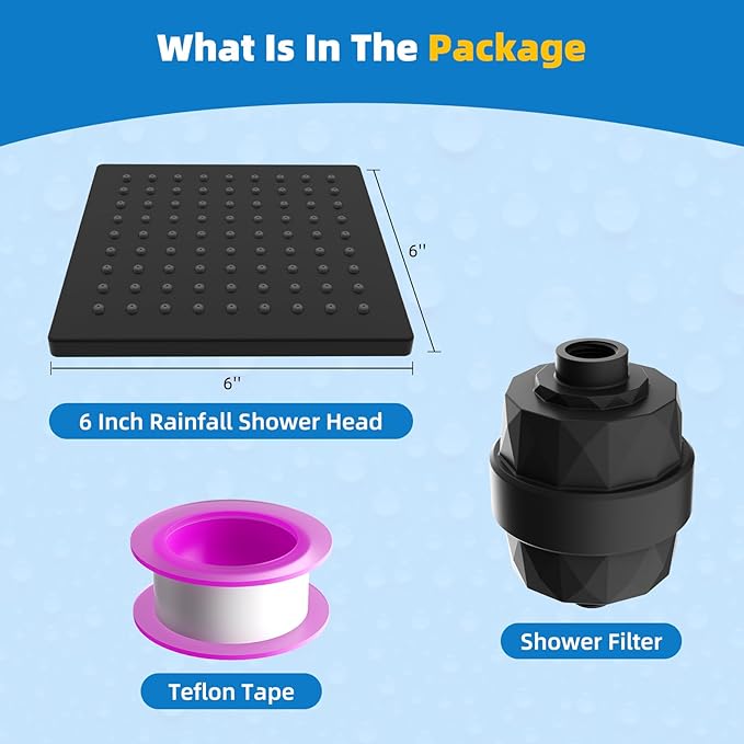 - High-quality Material: The 6-inch rainfall shower head with filter boasts a substantial, artfully crafted body of premium ABS plastic, complemented by a back panel of certified SUS 304 stainless steel. This material composition ensures the square fixed showerhead is rustproof, lightweight, and built to withstand the test of time, and it also has an excellent elegance and durability that will serve you for years to come