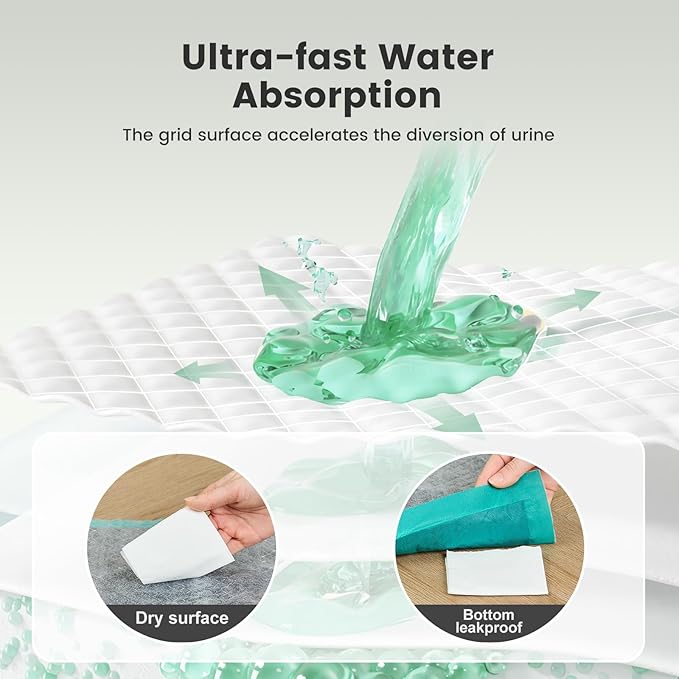 - 【Leak-Proof】Surface grid efficiently directs liquids, swiftly absorbing liquid to maintain a dry surface. The bottom PE film, offering 100% leakage-proof, which prevents urine leakage from dirtying the floor or causing moisture in the litter system.