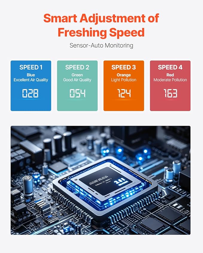 - Auto Mode-Smart Purification Speed Adjustment: The air purifier’s sensors monitor air quality in real-time and automatically adjust purification speed. The smart transition from green (speed 1) to red (speed 4) is clear and intuitive, allowing you to enjoy clean air without worrying about settings.