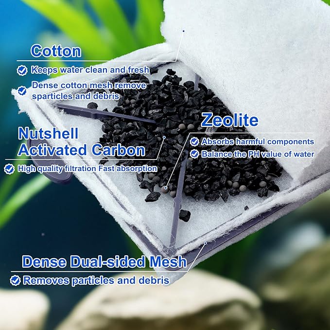 - 【Four-Stage Filtration】The filter is made of dense dual-sided mesh, the better the filtration effect. With 25% more active activated carbons and zeolites are added to effectively filter and absorb impurities in water, maintain a clean water source, and provide a healthy growth environment for fish.