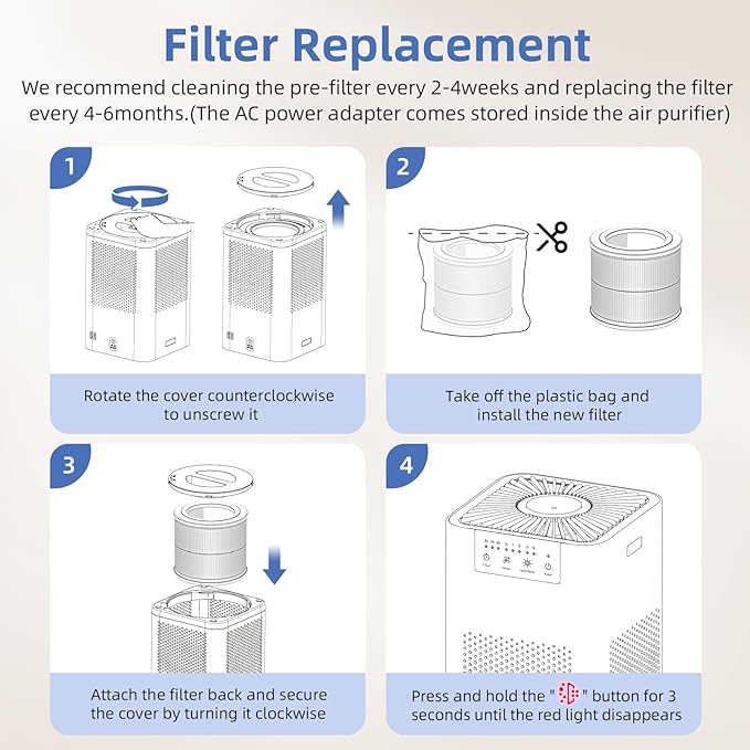 - REPLACEMENT FILTERS: AP100-RF - Basic air purifying filter (Search B0D9Q11D89); AP100-RF-PA - Pet-specific, absorbs odors & dander (Search B0D72V2QG3); AP100-RF-SR - Multi-functional, captures hair/pollen, eliminates odors & decomposes harmful gases (Search B0DP2BYRFP).
