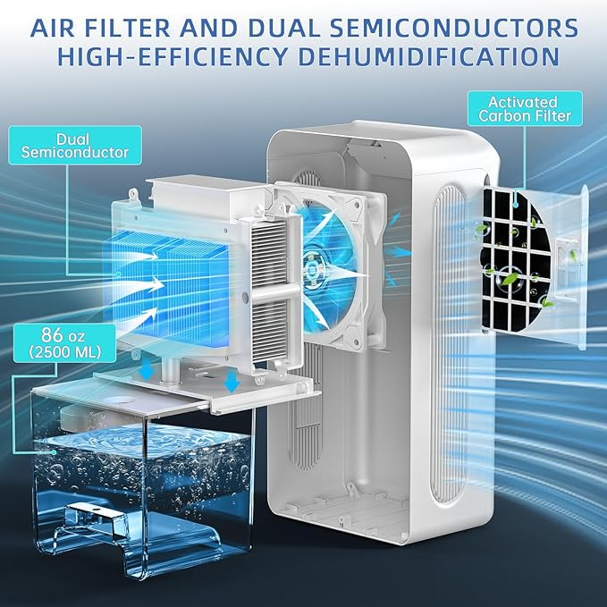 - 【Say Goodbye to Dampness】Nobody likes a sticky, humid home. Fortunately, the LOMMOL86oz 2500ml dehumidifier is here to help. With its stylish design and potent semiconductor technology, this dehumidifier allows you to improve the cleanliness and livability of your home.although its dehumidification effect may not be as powerful as compressor types, it operates with lower noise, lower energy consumption, and is budget-friendly, making it perfect for home use