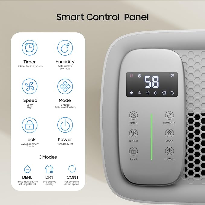 - Intelligent Touch Control: Dehumidifier for home & basement integrating a smart control panel, the humidity reading display helps maximize the convenience to monitor the humidity, adjust the humidity level. 24H TIMER: For preset operation and reduced energy consumption. Dual fan speeds (High for quick dehumidification/Low for quiet night operation) Child lock: for family safety and convenience.
