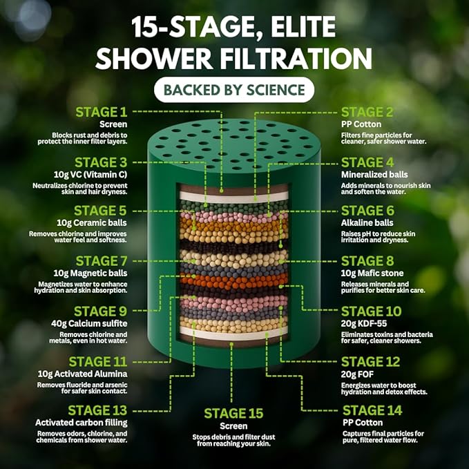 - 15-STAGE POWERFUL FILTRATION: Utilizes KDF‑55, calcium sulfite, aluminum oxide & coconut shell activated carbon to remove chlorine, fluoride, heavy metals, sediments, residual pharmaceuticals and other toxic contaminants. Designed by a team obssessed with improving your health from the inside out.