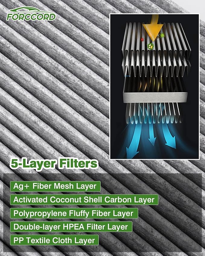 - 【5 Layers Newly Material】Compare with Standard cabin air filter, we adopts a newly upgraded large-capacity five-layer blue silk filter cloth+melt blown cloth, Double layer HEPA filter,which can remove 99.9% of harmful pollutants(dust, pollen,exhaust, etc)
