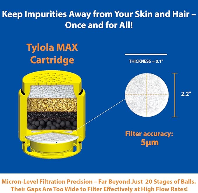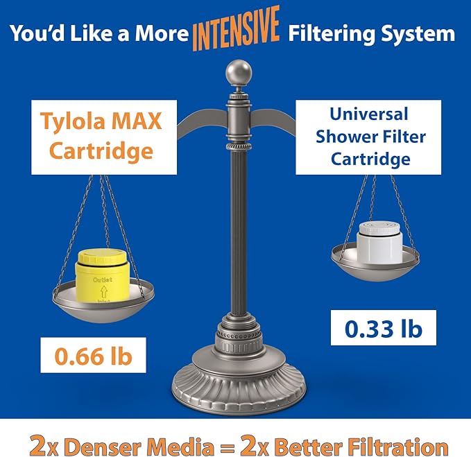 - 【REAL HEAVY-DUTY DESIGN – BUILT TO OUTLAST】 Tylola MAX isn’t your average shower filter. With 2× denser media and a weight of 0.66 lb, it packs more filtration power and durability than standard lightweight models. Perfect for high-pressure U.S. showers.