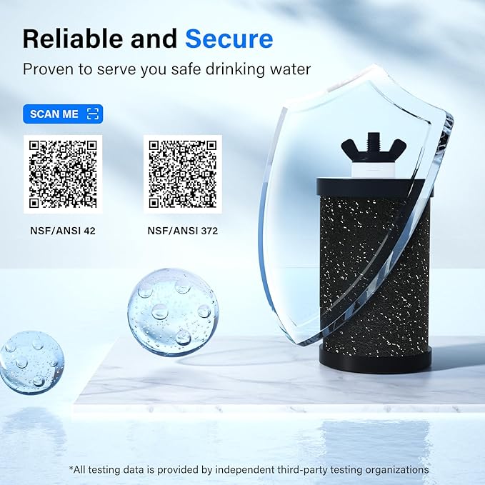 - [Advanced 4-Stage Filtration] Certified by NSF/ANSI 42, our composite filter features advanced 4-stage filtration technology, including a 0.01μm hollow fiber ultrafiltration membrane, alkaline materials, a silver ion barrier and high-density activated carbon block. This powerful system removes 99.9% of chlorine, rust, sediment, organic compounds and heavy metals, while alkalizing the water. Compliant with NSF/ANSI 372 lead-free standards, it guarantees safe and reliable filtration for daily use.