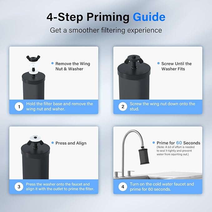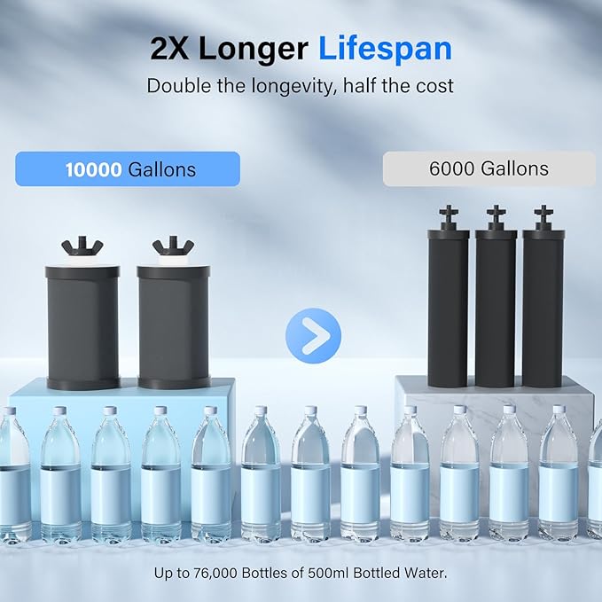 - [Nearly Double the Lifespan] Each pair of upgraded composite filters can provide up to 10,000 gallons of fresh water, which is 4,000 gallons more than the standard 6,000-gallon lifespan of most filters on the market. This allows one household to reduce up to 80,000 plastic bottles (500ml) within 3 years, contributing to a more sustainable and eco-friendly lifestyle. Note: TDS levels do not fully reflect water quality, and our filters are not designed to reduce TDS levels.