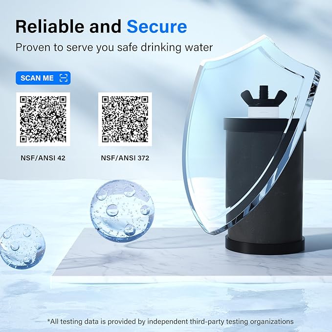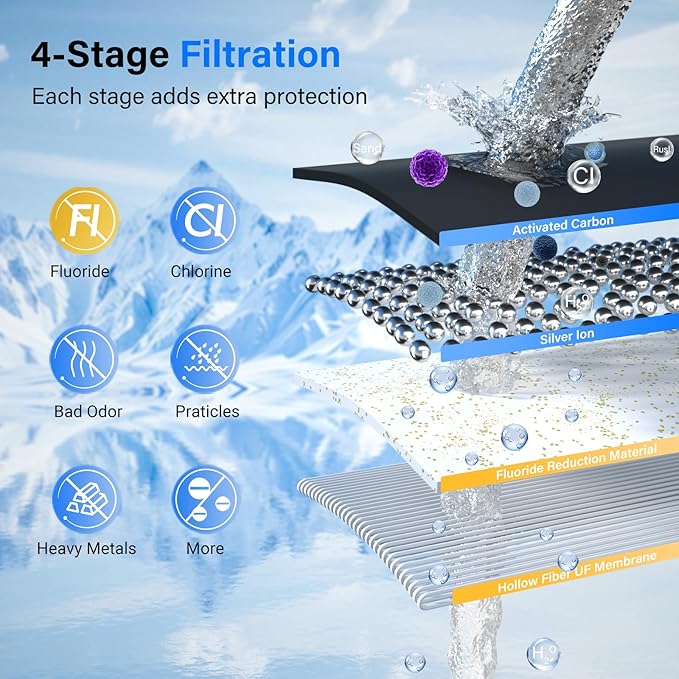 - [Advanced 4-Stage Filtration] Certified by NSF/ANSI 42, our composite filter features an advanced 4-stage filtration technology. It combines a 0.01μm hollow fiber ultrafiltration membrane, fluoride removal media, a silver ion barrier, and high-density activated carbon block. This design removes 99.9% of chlorine, rust, sediment, organic compounds, and heavy metals, plus 90% fluoride. Compliant with NSF/ANSI 372 lead-free standards, it ensures safety and reliability for everyday use.