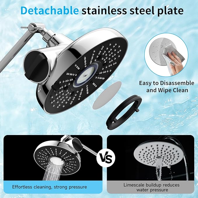 - Power Massage:The laser-drilled stainless steel plate delivers a high-pressure, skin-friendly water flow for a deep massage. It rinses off soap quickly, saving time and water