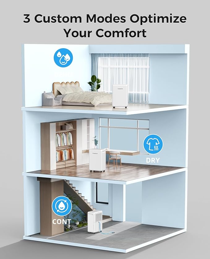 - 3 Smart Modes for Every Need - The high-performance dehumidifiers have 3 modes of dehumidification. DEHU Mode adjusts humidity from 30%-80% with 2 fan speeds to perfectly suit your room conditions, DRY Mode quickly dries wet clothes – ideal for rainy seasons, CONT Mode runs non-stop until reaching your target humidity – best for basements and high-moisture areas. (Tips:Keep windows and doors closed during operation to maximize dehumidifying efficiency)