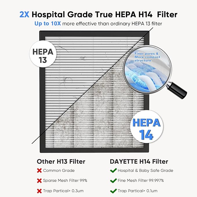 - ใ๐๐จ๐ฐ๐๐ซ๐๐ฎ๐ฅ ๐๐๐ ๐๐๐๐ ๐ ๐ข๐ฅ๐ญ๐๐ซใOur New Air Purifiers upgraded to the H14 HEPA filter, which can capture 99.997% of particles as small as 0.1 micron, more efficient and powerful than H13, combined with pre-filter, H14 HEPA filter, activated carbon filter and net filter to achieve the highest performance, such as dust, smoke, pollen, hair and odor. You can enjoy a fresher, cleaner air environment and breathe easier