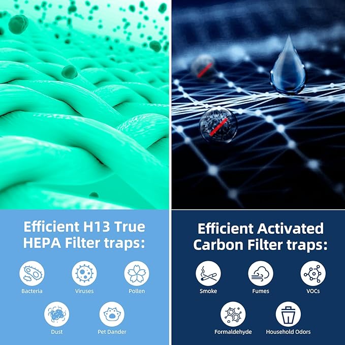 - 【Activated Carbon Pre-filter】:The activated carbon pre-filter of filter collects dust,pet hair,and other large particles, while extending the life of the HEPA filter.Treated carbon take in volatile organic compounds from the air and reduces odors from smoking, cooking and pets.