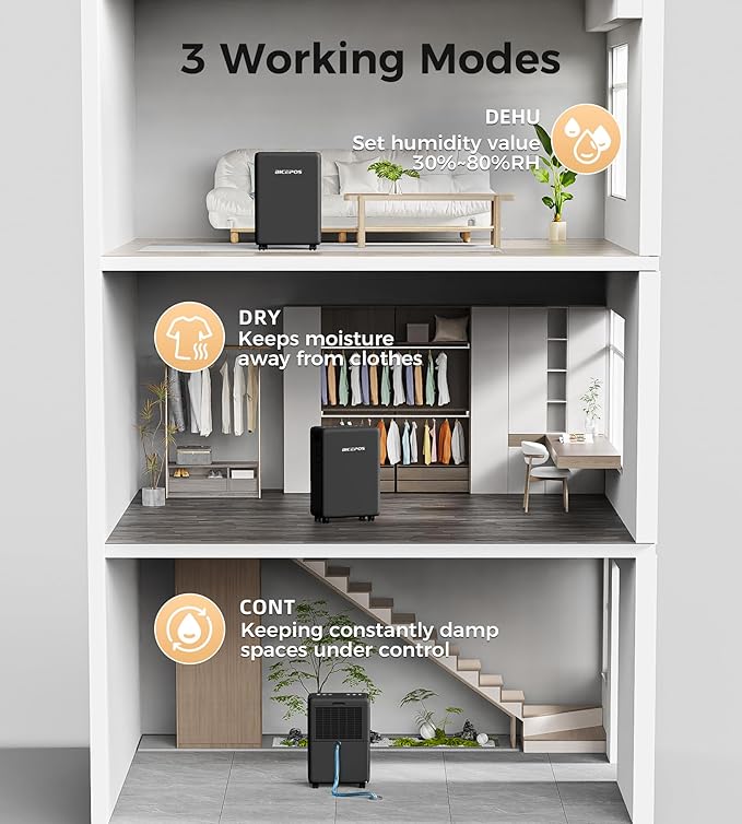 - Innovative Design for Safety and Convenience - The Bicepos dehumidifier combines seamless mobility with 4 smooth-rolling casters and ergonomic handles for effortless portability. Advanced auto-restart and auto-defrost ensure uninterrupted performance in any condition. Perfect for homes, offices, and more, it delivers reliable, long-lasting dehumidification