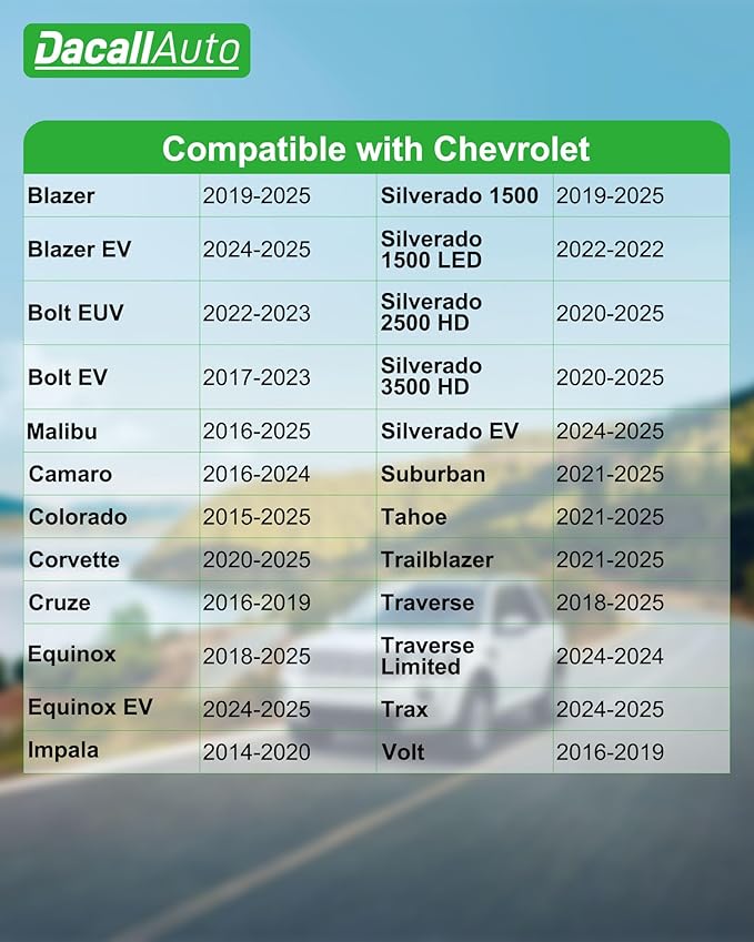 - Fit for Chevrolet: (2019-2025) Blazer, (2024-2025) Blazer EV, (2022-2023) Bolt EUV, (2017-2023) Bolt EV, (2016-2024) Camaro, (2015-2025) Colorado, (2020-2025) Corvette, (2016-2019) Cruze, (2018-2025) Equinox, (2024-2025) Equinox EV, (2014-2020) Impala, (2016-2025) Malibu