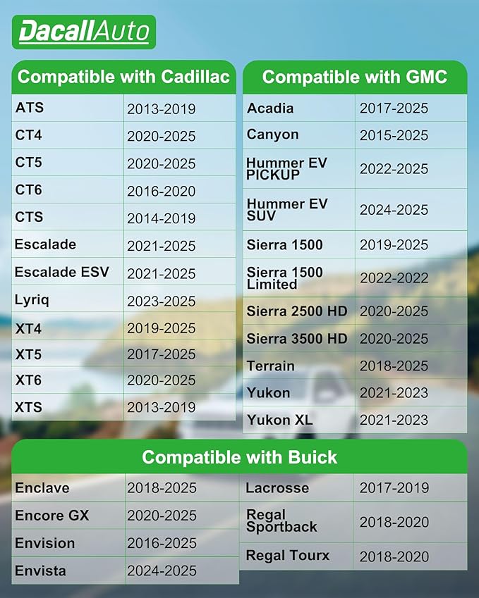 - Fit for GMC: (2017-2025) Acadia, (2015-2025) Canyon, (2022-2025) Hummer EV Pickup, (2024-2025) Hummer EV SUV, (2019-2025) Sierra 1500, (2022) Sierra 1500 Limited, (2020-2025) Sierra 2500 HD, (2020-2025) Sierra 3500 HD, (2018-2025) Terrain, (2021-2023) Yukon, (2021-2023) Yukon XL
