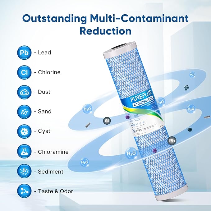 - Great Filtration Capacity: PUREPLUS CTO20BB-CQB filter reduces up to 99% of Chlorine, sand, rust, sediment, taste, and color. The enhanced carbon block cartridge effectively traps lead particles and cysts, ensuring clean and safe water.