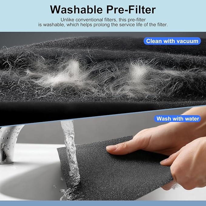 - [Washable Pre-Filter & Extended Lifespan] The high-quality washable pre-filter effectively traps pet hair and large debris, and can be cleaned with water every 1-2 months. Regular maintenance of the pre-filter helps prolong the life of the H13 filter, enhancing cost-effectiveness.